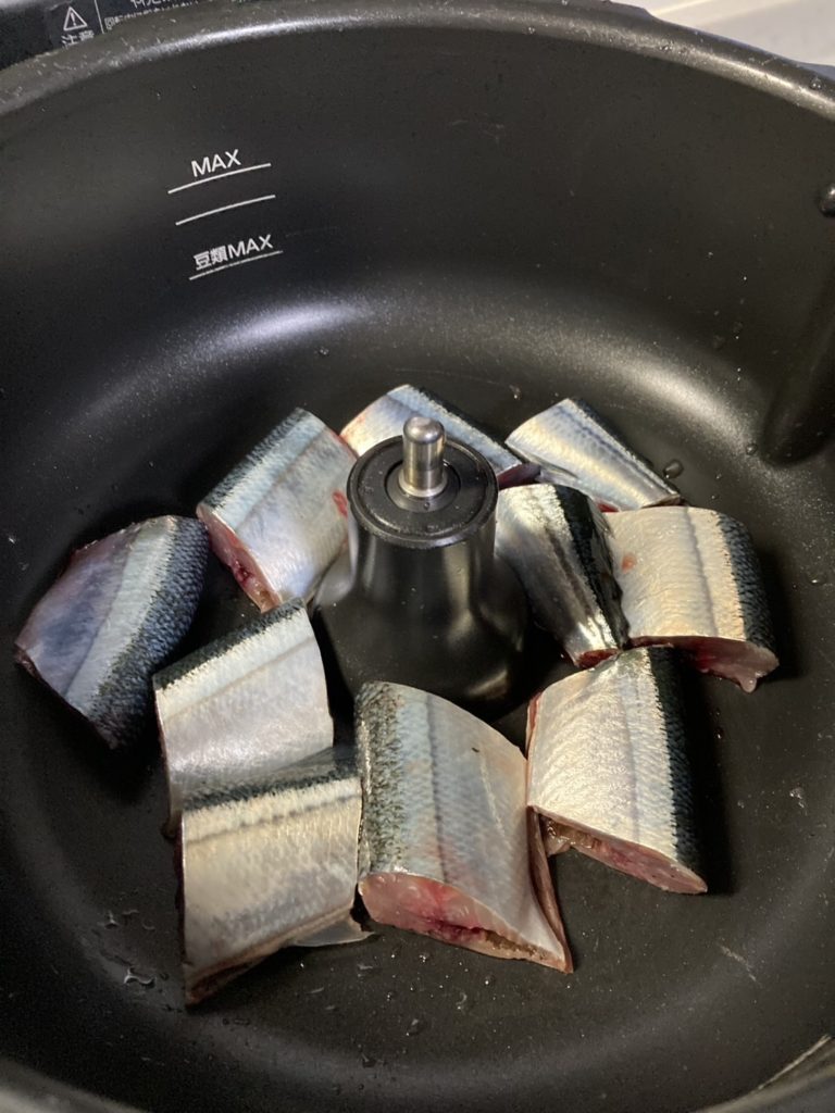 秋刀魚を適当な大きさに切り、オートクッカーへ。